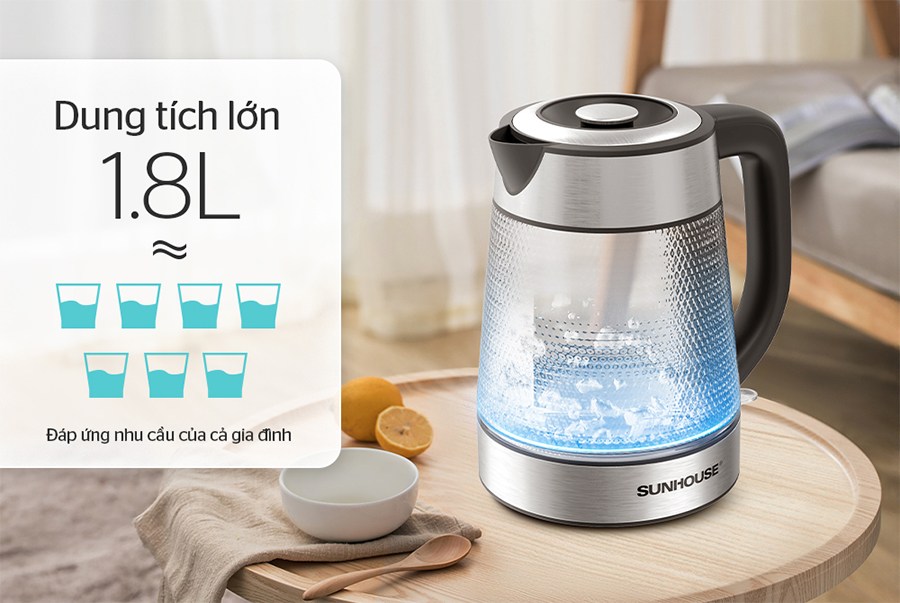 Bình đun Sunhouse SHD1220 có dung tích 1.8 lít, sẽ cung cấp đủ nước sôi để nấu mì, pha trà, cà phê, pha sữa…Phù hợp với nhu cầu sử dụng của các thành viên trong gia đình, nhân viên văn phòng, sinh viên ở trọ, quán nước nhỏ,...