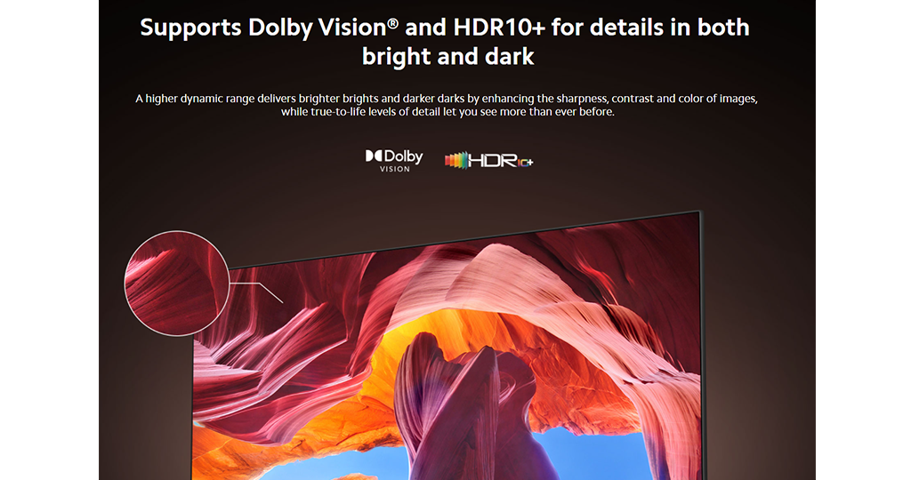 Bộ đôi Dolby Vision và HDR 10+ tối ưu khả năng hiển thị rõ nét các chi tiết ở những vùng quá sáng hoặc quá tối.