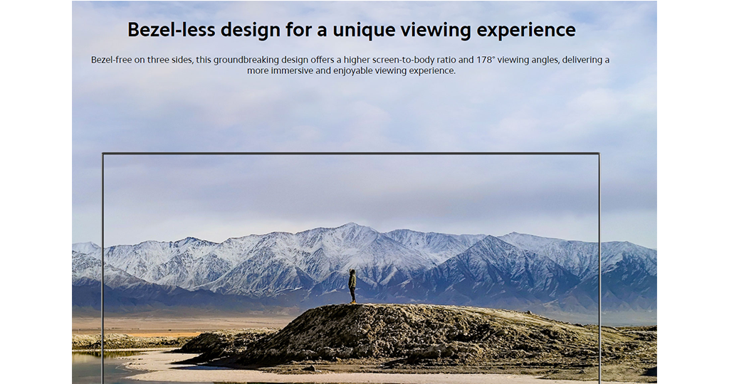 Thiết kế cạnh viền siêu mảnh manh đến trải nghiệm xem độc đáo. Thiết kế đột phá này mang lại tỷ lệ màn hình so với thân máy cao hơn và góc nhìn lên đến 178 độ.