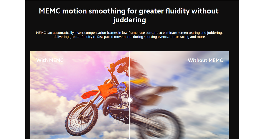 Công nghệ MEMC có thể tự động chèn các khung hình bù vào những nội dung, những pha hành động tốc độ cao, hạn chế tình trạng mờ nhòe, giật hình, mang lại những thước phim mượt mà, sắc nét và hơn thế nữa.
