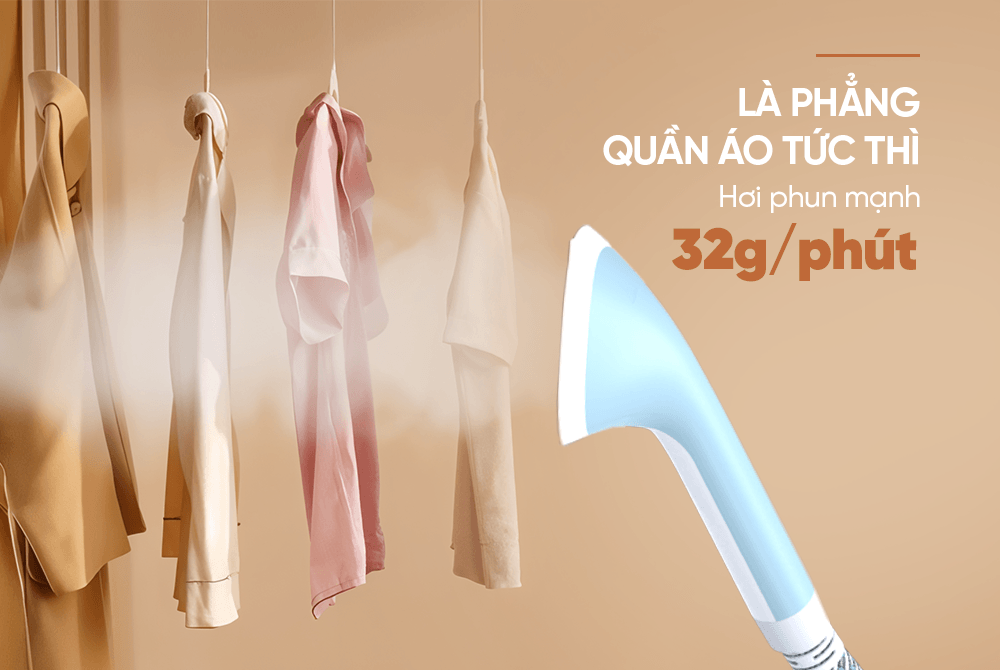 Hơi phun cực mạnh 32g/phút, hơi nước được tạo ra ổn định và mạnh mẽ giúp thẩm thấu nhanh, làm mềm sợi vải và dễ dàng xóa bỏ nếp nhăn chỉ sau vài lượt lướt nhẹ. Đạt hiệu quả với cả chất liệu dày như jeans, linen đến vải mỏng như lụa, voan...