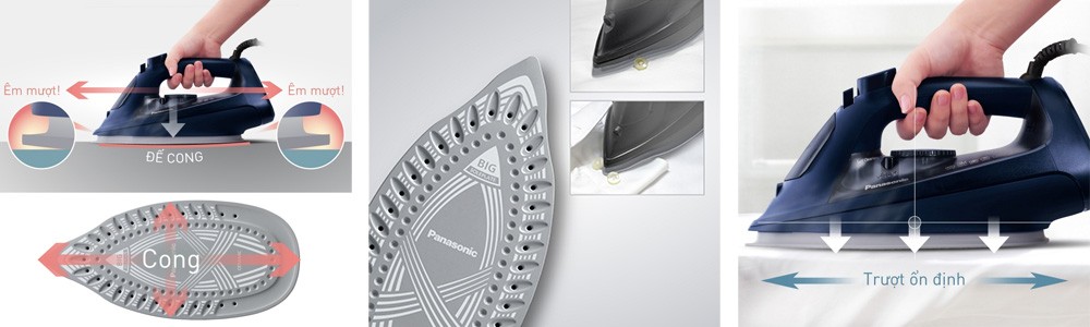 Mặt đế Ceramic chống dính cao cấp hình chữ U dễ dàng di chuyển, mũi nhọn và rãnh cúc giúp bàn ủi luồn lách vào các vị trí khó ủi như cổ áo, nách áo để làm phẳng tốt hơn.