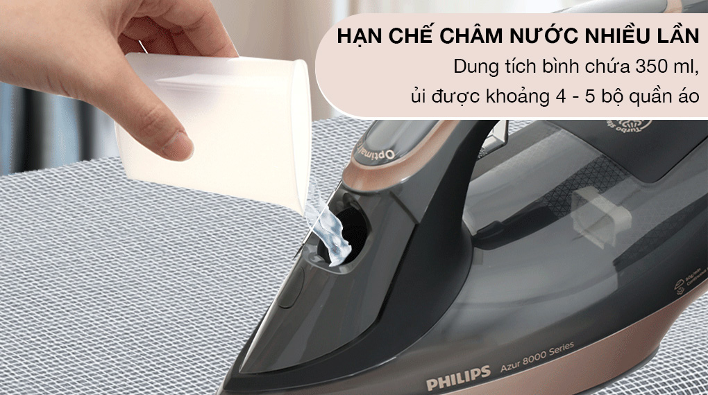 Ngăn chứa nước dung tích 350ml ủi được tầm 4-5 bộ quần áo trong một lần ủi. Lưu ý: Nên sử dụng nước sạch cho vào bình, không nên dùng nước hoa hoặc các loại nước khác.