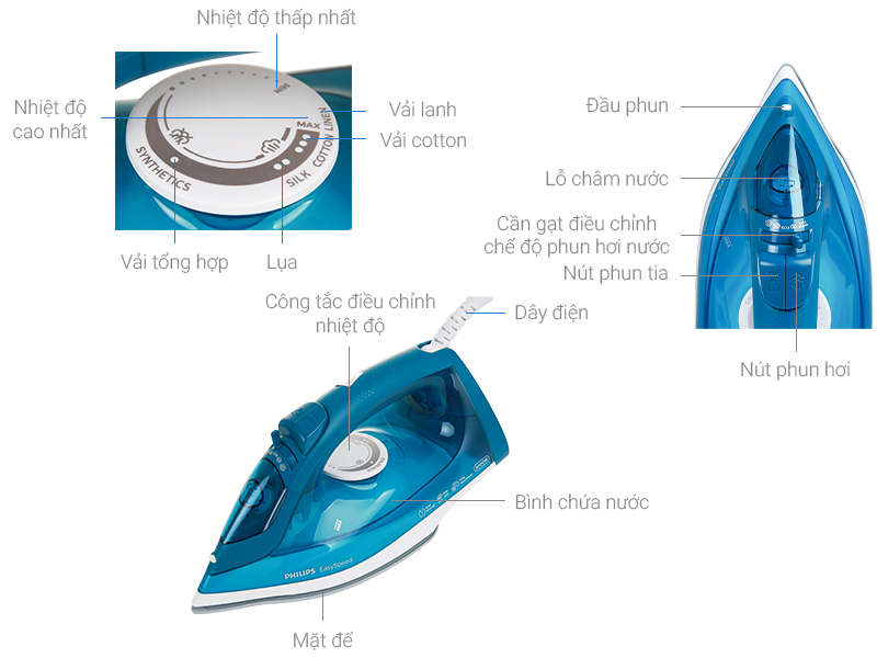 Tích hợp nhiều chức năng ủi gồm phun hơi, phun tia, ủi khô và ủi hơi nước. Điều khiển núm xoay để chọn nhiệt độ phù hợp cho từng chất liệu vải hoặc nếu bạn muốn ủi hơi nước thì nhấn nút kích hoạt chế độ hơi nước và nút gạt tùy chỉnh mức độ ủi phun hơi thuận tiện.