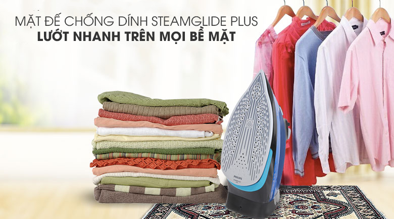 Mặt đế chống dính SteamGlide Plus - độc quyền của Philips, được tráng 6 lớp chống ăn mòn, chống trầy cực bền tốt, lướt nhẹ và êm ái trên mọi chất liệu vải, làm sạch đơn giản khi cần