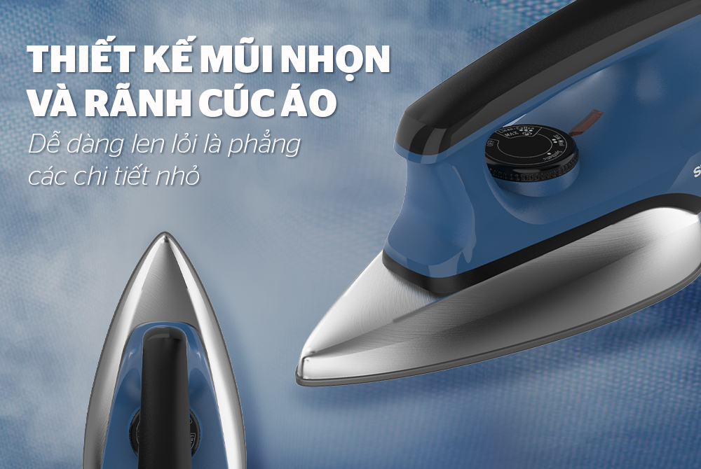 Mũi bàn ủi nhọn giúp len lỏi tốt vào các vùng ủi hẹp như cổ áo, hai hàng cúc, nách áo,...