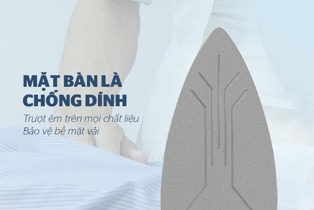 Bề mặt bàn ủi được phủ lớp chống dính siêu bền, giúp bàn ủi trượt êm trên mọi chất liệu, tránh làm cháy xém quần áo, hạn chế bóng vải và dễ dàng vệ sinh khi cần thiết.