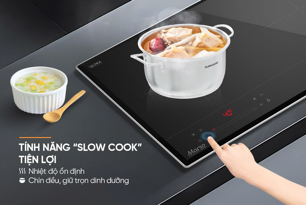 Tính năng nấu chậm SLOW COOK cho phép duy trì nhiệt độ thấp, chính xác và ổn định suốt quá trình nấu, tránh tình trạng bị đóng ngắt liên tục làm gián đoạn quá trình chế biến như các dòng bếp từ thông thường . Nhờ vậy, món ăn không chỉ được nấu chín đều mà còn giữ vẹn nguyên hàm lượng chất dinh dưỡng cao, mang lại hương vị đậm đà và tốt cho sức khỏe.