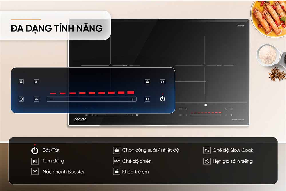 Các tính năng như hẹn giờ lên đến 4 tiếng và khóa trẻ em giúp bảo đảm an toàn trong thời gian nấu nướng kéo dài. Bếp từ còn tích hợp nhiều chức năng nấu riêng biệt, nâng cao tiện ích cho người sử dụng.