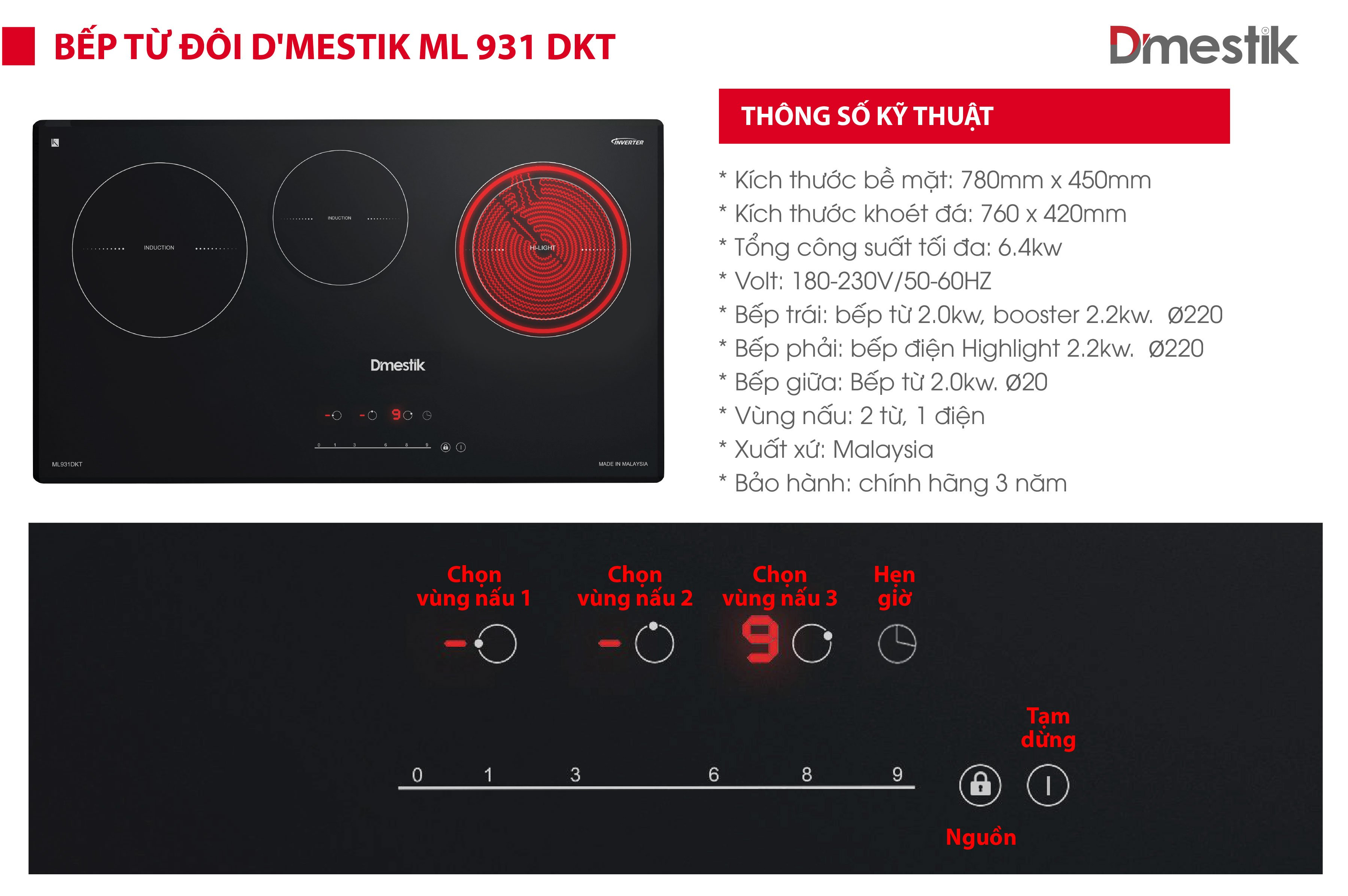 Bếp điện từ hồng ngoại D'mestik ML 931 DKT là sự kết hợp độc đáo với 2 vùng bếp từ và 1 vùng bếp hồng ngoại tiện lợi cho việc nấu nướng. Đối với 2 vùng bếp từ thích hợp cho nồi/chảo đáy từ và vùng bếp hồng ngoại thì sử dụng được với tất cả các loại nồi/chảo. Đó chính là sự tiện lợi mà chiếc bếp này mang lại.