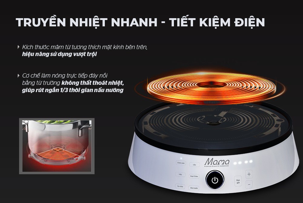 Bếp điện từ Sunhouse Mama SHD6885 có công suất 2100W giúp quá trình gia nhiệt diễn ra nhanh hơn. Cơ chế làm nóng trực tiếp đáy nồi bằng từ trường và nhiệt năng chỉ tập trung vào vùng cần nấu chín giúp thực phẩm chín nhanh, rút ngắn thời gian nấu nướng.
