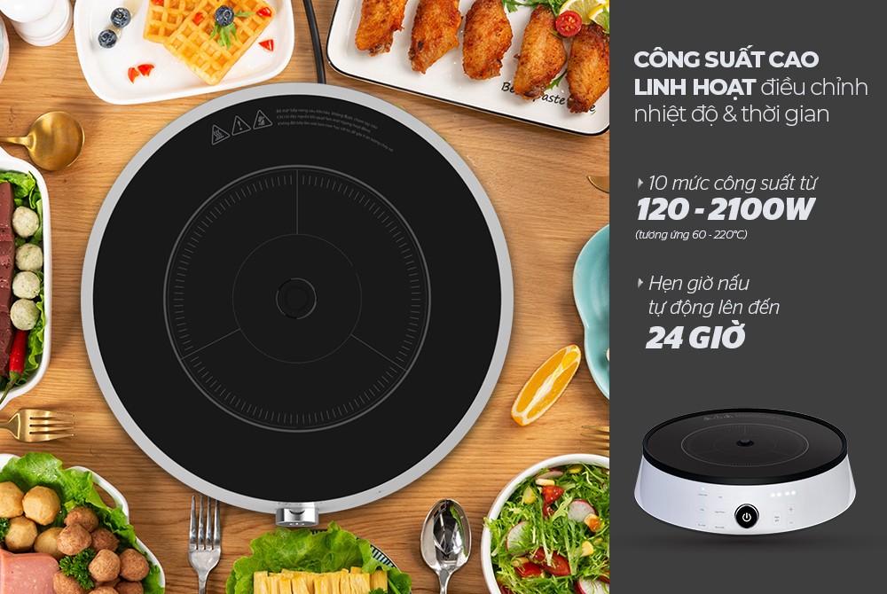 Bếp có 10 mức gia nhiệt từ 120W đến 2100W (tương ứng từ 60°C đến 220°C) cùng 6 chức năng nấu cài sẵn (Lẩu, chiên, xào, nấu, đun nước, súp/cháo), đáp ứng đa dạng nhu cầu sử dụng.