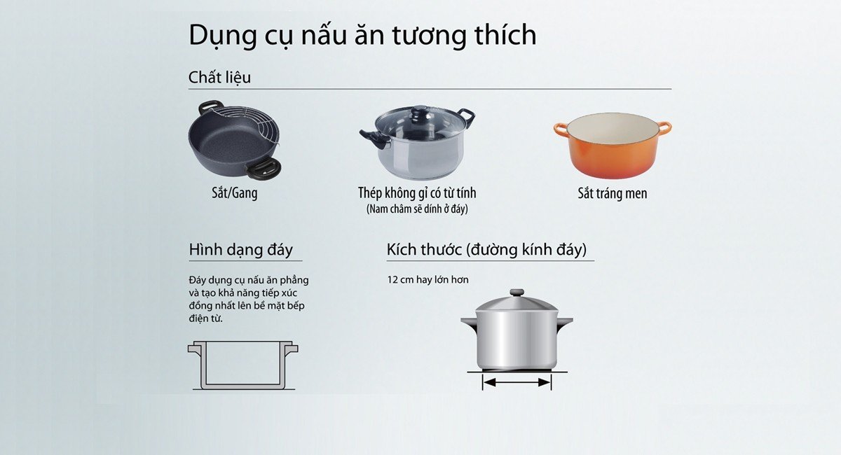 | Loại nồi/chảo tương thích | Nồi/chảo đáy từ |