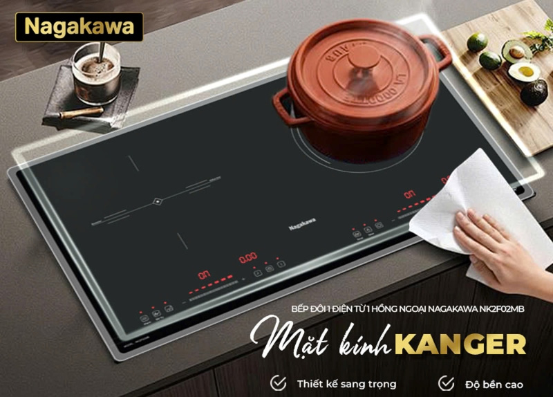 Bếp đôi điện từ hồng ngoại Nagakawa NK2F02MB có kiểu dáng sang trọng với mặt kính phối màu mới lạ, điểm nhấn là hoạt tiết vuông mới lạ so với các kiểu bếp điện thông thường. Các chi tiết còn lại của bề mặt bếp như phím điều khiển được thiết kế tối giản tạo nên vẻ đẹp tinh tế cho sản phẩm.