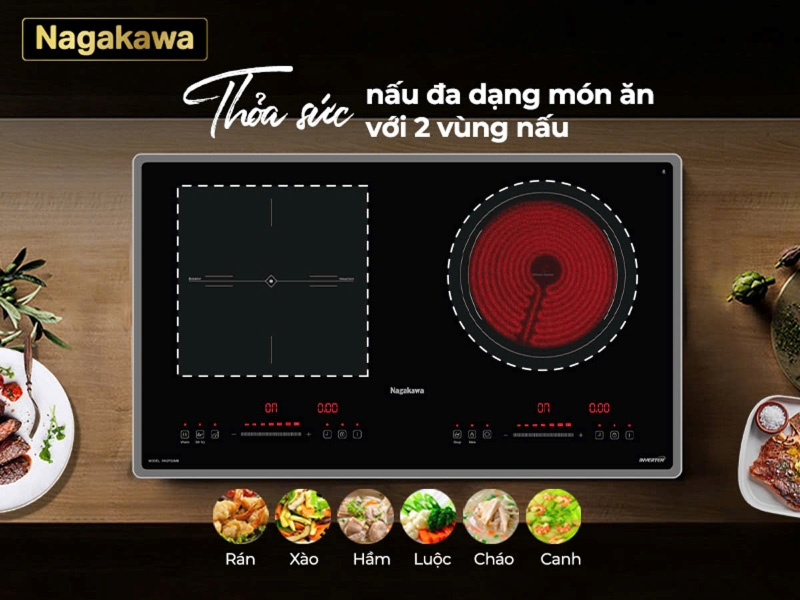 Bếp đôi điện từ hồng ngoại Nagakawa NK2F02MB gồm 2 vùng nấu riêng biệt bao gồm: