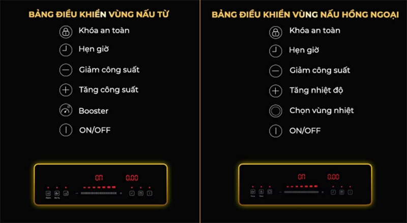 | 1 vùng nấu điện từ | 1 vùng nấu hồng ngoại | |