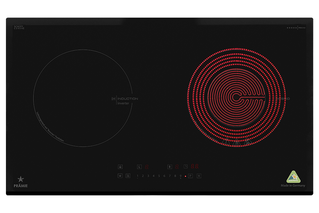 Bếp đôi PRDE-2123 gồm 2 vùng nấu riêng biệt bao gồm 1 vùng nấu điện từ (dùng được nồi/chảo đáy nhiễm từ) và 1 vùng nấu hồng ngoại (dùng được tất cả các loại nồi/chảo).