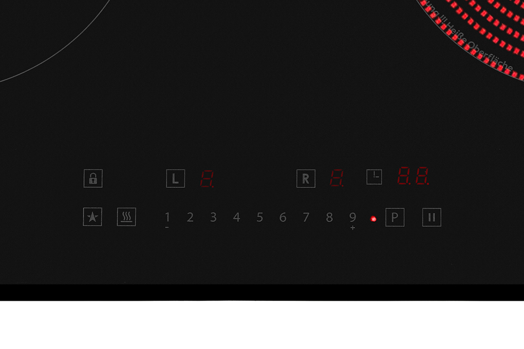 Bếp đôi có bảng điều khiển cảm ứng riêng biệt gồm 9 mức công suất tùy chỉnh, các phím chức năng (Booster, hẹn giờ, tạm dừng,...) được thể hiện rõ ràng và dễ sử dụng với các thông số hiển thị bằng đèn LED đỏ.