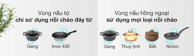 | Tương thích với | Điện từ : Nồi/chảo đáy nhiễm từ Hồng ngoại : Tất cả loại nồi/chảo |