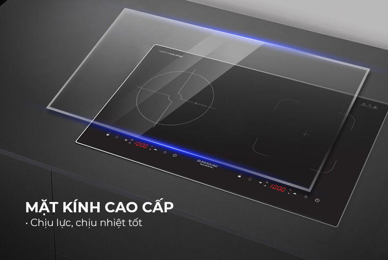 Mặt kính cao cấp chịu lực chịu nhiệt tốt với 2 vùng nấu rộng rãi, giúp nấu nướng được nhiều món cùng lúc. Cũng nhờ mặt kính tốt nên hiệu suất của bếp cũng cải tiến đáng kể.