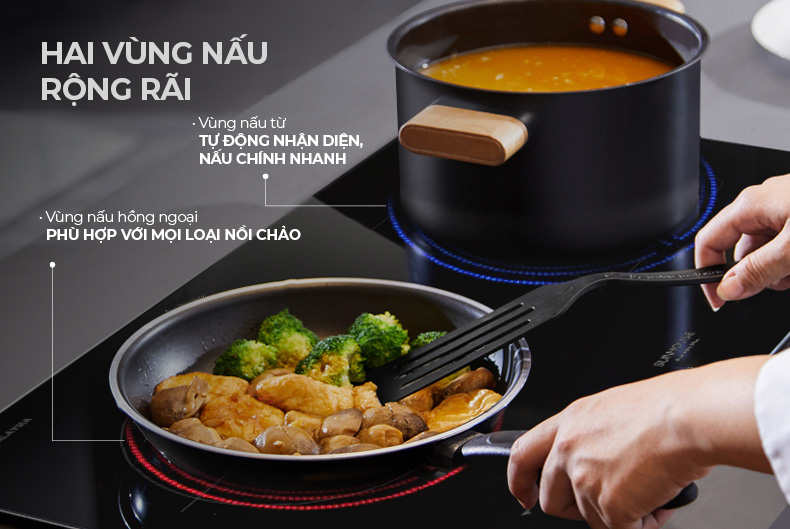 | Loại nồi/chảo thích hợp | Vùng hồng ngoại phù hợp với mọi loại nồi/chảo Vùng điện từ phù hợp với nồi/chảo đáy từ  |