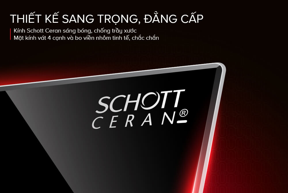 Xuất xứ từ Đức – một quốc gia với sự chặt chẽ trong tiêu chuẩn chất lượng, bếp đôi điện từ Mutlich được trang bị mặt kính Schott Ceran siêu bền với khả năng chống sốc nhiệt cao (tới 700oC). Bên cạnh đó, kính Schott Ceran có khả năng chịu lực lên tới 1000 độ C và chịu nhiệt tới 15kg. Không chỉ thế, mặt kính Schott Ceran có đặc điểm là láng mịn, phẳng giúp dễ dàng trong việc vệ sinh sau khi nấu ăn. Đặc biệt, có khả năng chống chống trầy xước trước những tác động bên ngoài, giúp tăng độ bền cho sản phẩm.