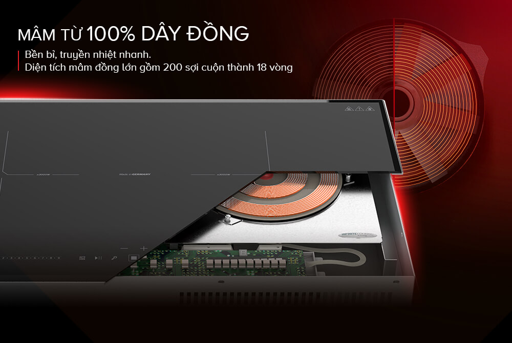 Bếp từ đôi Mutlich MIG9009 sở hữu 2 vùng nấu rộng rãi với mâm từ bằng đồng nguyên chất bền bỉ, kết cấu dày dặn với 18 vòng và 200 sợi. Với kết cấu dày dặn như vậy giúp sản phẩm truyền nhiệt tốt hơn. Ngoài ra, bếp có chức năng Booster giúp đẩy công suất lên đến 3000W giúp bạn nấu nướng nhanh và tiết kiệm thời gian hơn.