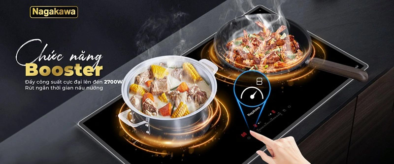 Với chức năng Booster giúp bạn lựa chọn mức công suất cao nhất khi muốn nấu các món đặc trưng cần gia nhiệt nhanh, giúp lưu giữ đúng hương vị món ăn mong muốn. Khi lựa chọn chức năng Booster, công suất bếp sẽ nhanh chóng được đẩy lên mức cực đại trong thời gian cực ngắn, rút ngắn tối đa thời gian nấu ăn.