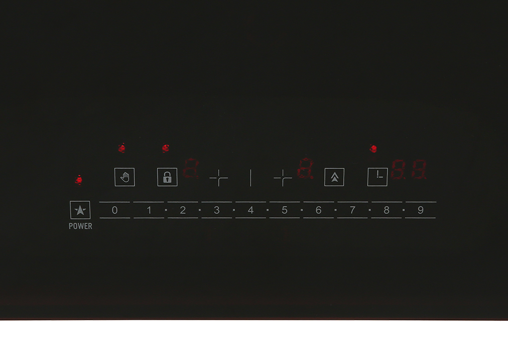 Bảng điều khiển cảm ứng có 9 mức công suất, các phím chức năng (Booster, hẹn giờ, tạm dừng,...) được thể hiện rõ ràng và dễ sử dụng với các thông số hiển thị bằng đèn LED đỏ.