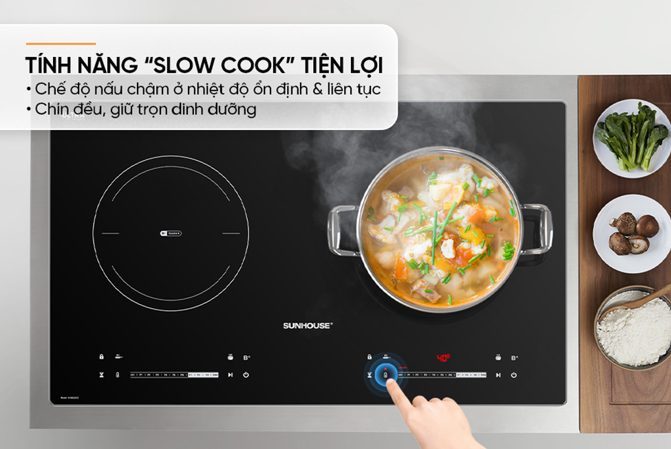 Nhằm nâng cao trải nghiệm sử dụng, bếp còn được tích hợp nhiều chế độ nấu nướng tiện lợi như chế độ chiên, xào, nấu nhanh… Đặc biệt, tính năng Slow Cook là nấu chế độ chậm ở nhiệt độ thấp và ổn định trong suốt quá trình nấu, không bị đóng ngắt liên tục như các dòng bếp từ thông thường, giúp kiểm soát và đảm bảo nhiệt độ luôn chính xác.