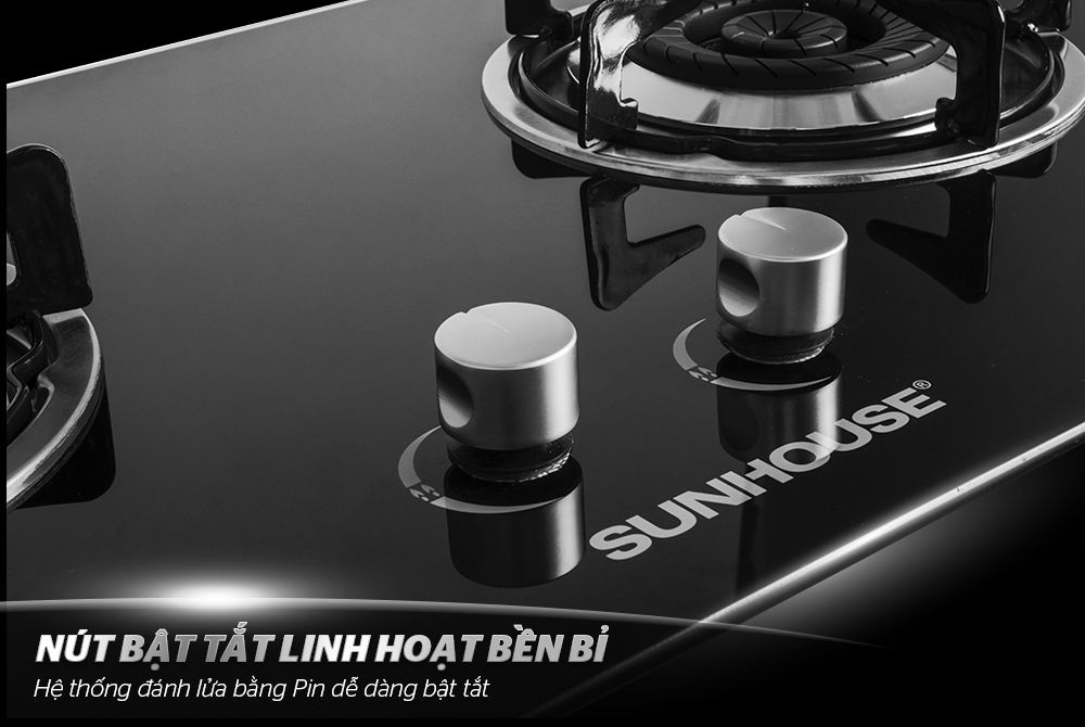 Bếp gas âm kính Sunhouse SHB6636 có hệ thống đánh lửa bằng PIN rất an toàn, tiện lợi. Bạn dễ dàng bật tắt và điều chỉnh lửa bằng 2 núm vặn cực nhạy, chỉ cần xoay 1 lần là lửa đã cháy, không cần bật nhiều lần gây rò rỉ và hao phí gas.