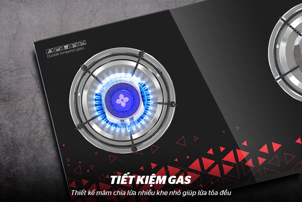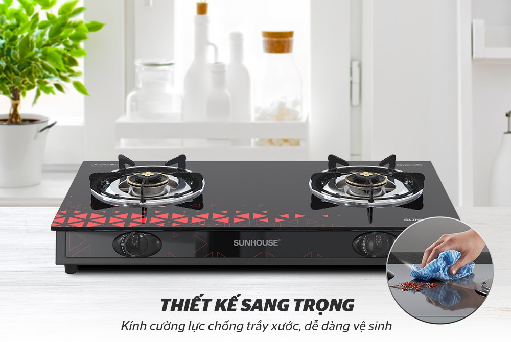 Với 2 lò đun, điều khiển lửa to nhỏ bằng núm vặn tiện lợi, chế biến được nhiều món ăn cùng lúc. Mặt kính vừa mang lại tính thẩm mỹ cao vừa có khả năng chịu lực, chịu nhiệt, đồng thời dễ dàng vệ sinh sau khi sử dụng.