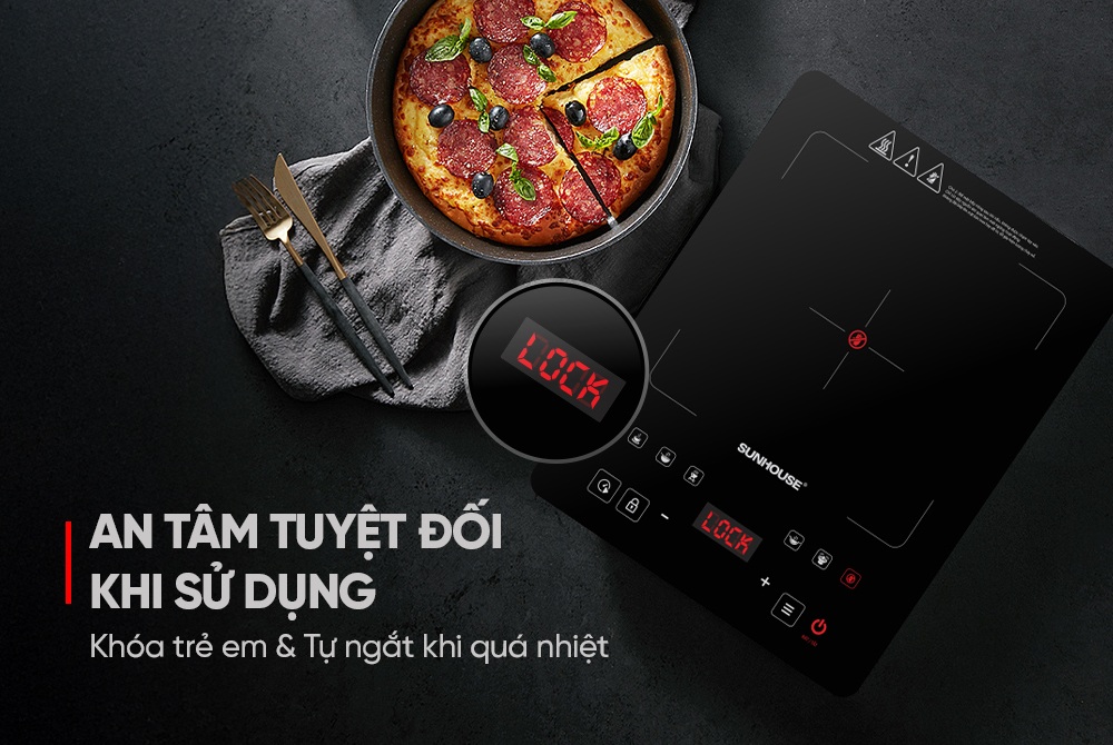 Trang bị chức năng khóa trẻ em an toàn, khóa toàn bộ các chế độ điều chỉnh khi kích hoạt, yên tâm sử dụng khi gia đình có trẻ em. Bếp có thiết bị bảo vệ quá nhiệt, sẽ tự động ngắt nguồn khi nồi, chảo quá nóng, vượt mức an toàn và sẽ hoạt động lại sau vài phút khi bếp nguội.