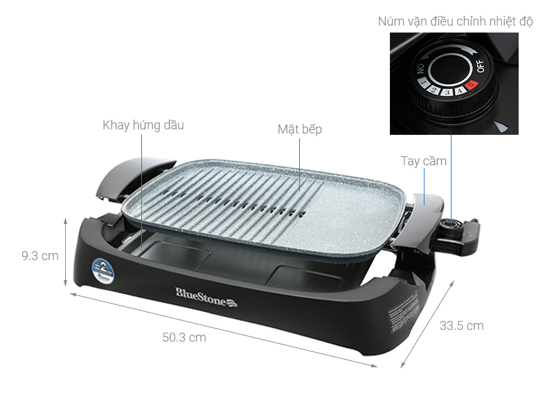 Bếp nướng điện BlueStone EGB-7417 công suất 2000W với 5 mức điều chỉnh nhiệt bằng núm xoay , mặt bếp nướng bằng hợp kim nhôm chống dính tốt, có tay cầm chống nóng tiện di chuyển khi dùng.