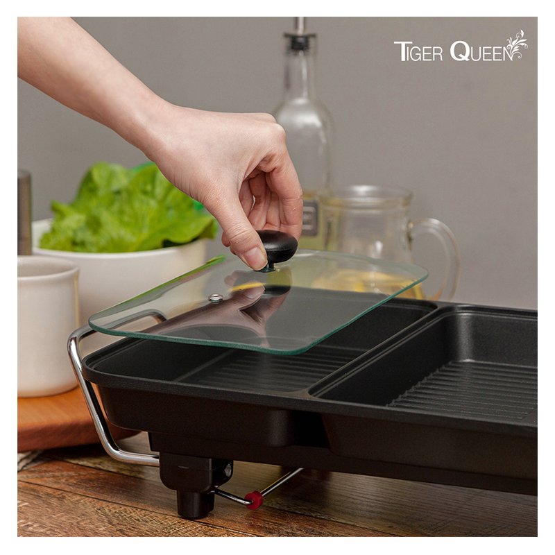 Bếp nướng điện đa năng 2 trong 1 Tiger Queen SQ-1400G được nhập khẩu từ Hàn Quốc vẫn mang những tính năng cơ bản của 1 chiếc bếp nướng nhưng khu vực bàn nướng của SQ-1400G đặc biệt được chia thành 2 ngăn gồm 1 ngăn nướng và 1 ngăn để chứa nước sốt, nước chấm hoặc phô mai tan chảy kéo sợi.