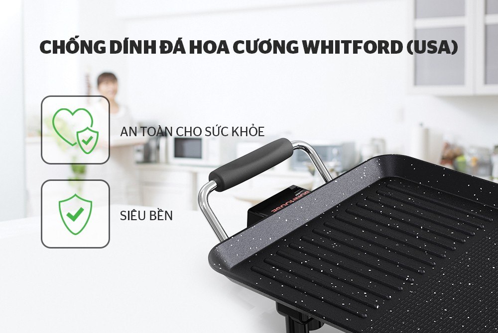 Mặt bếp nướng được phủ lớp chống dính đá hoa cương Whitford (USA) siêu bền kháng khuẩn. Chất chống dính này đã được chứng minh an toàn tuyệt đối cho sức khỏe, không chứa hóa chất gây hại, không thôi nhiễm ra thức ăn, chịu được nhiệt độ cao và chống mài mòn tốt.