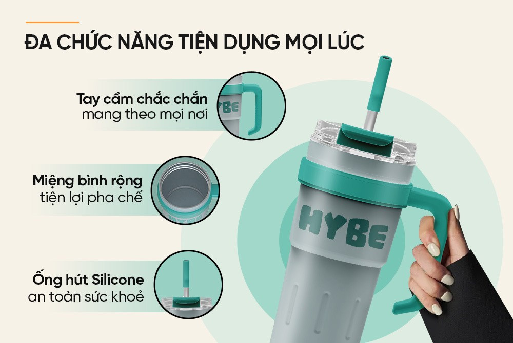 Bình có tích hợp tay cầm chắc chắn, giúp bạn thuận tiện mang theo bất kỳ đâu mà không lo trơn trượt hay bất tiện khi di chuyển. Và 1 chiếc ống hút bọc silicon mềm mại, an toàn với sức khỏe, đặc biệt tiện lợi khi bạn cần uống nhanh hoặc đang vận động.