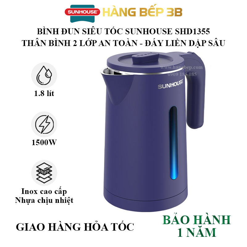 Bình đun nước 1.8 lít Sunhouse SHD1355 màu sắc sang trọng, thân bình chắc chắn, đun sôi nước nhanh vệ sinh dễ dàng là bạn đồng hành phải có ở mỗi gia đình.
