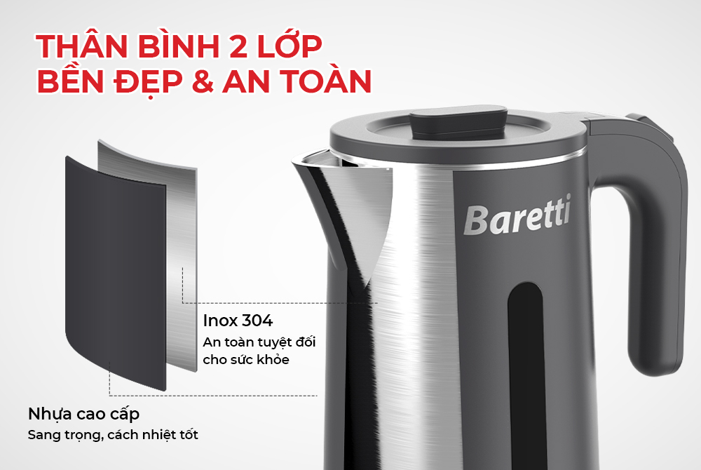 Bình đun siêu tốc Baretti được trang bị rơ le tự ngắt an toàn khi nước sôi cũng như cạn nước, quá nhiệt