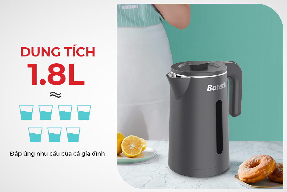 Bình đun siêu tốc Baretti BRD182 có dung tích 1.8 lít đủ dùng để nấu mì, pha sữa, trà, cafe....