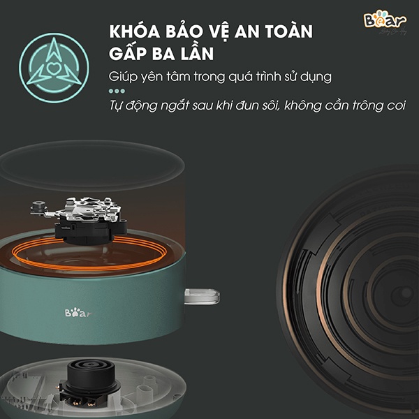 Chế độ ngắt tự động khi nước sôi hoặc cạn nước, đảm bảo an toàn tối đa cho người sử dụng (quên/bận rộn công việc khác). Chức năng này còn giúp làm tăng tuổi thọ sản phẩm và phòng chống cháy nổ.