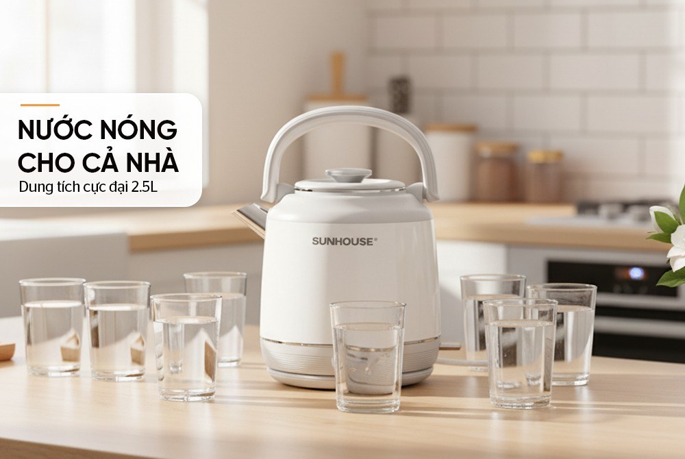 Bình đun siêu tốc inox Sunhouse SHD1392 có dung tích lớn 2.5 lít cùng công suất 1500W đun nước nhanh sôi, đáp ứng tốt nhu cầu sử dụng của gia đình, văn phòng, quán nước,...