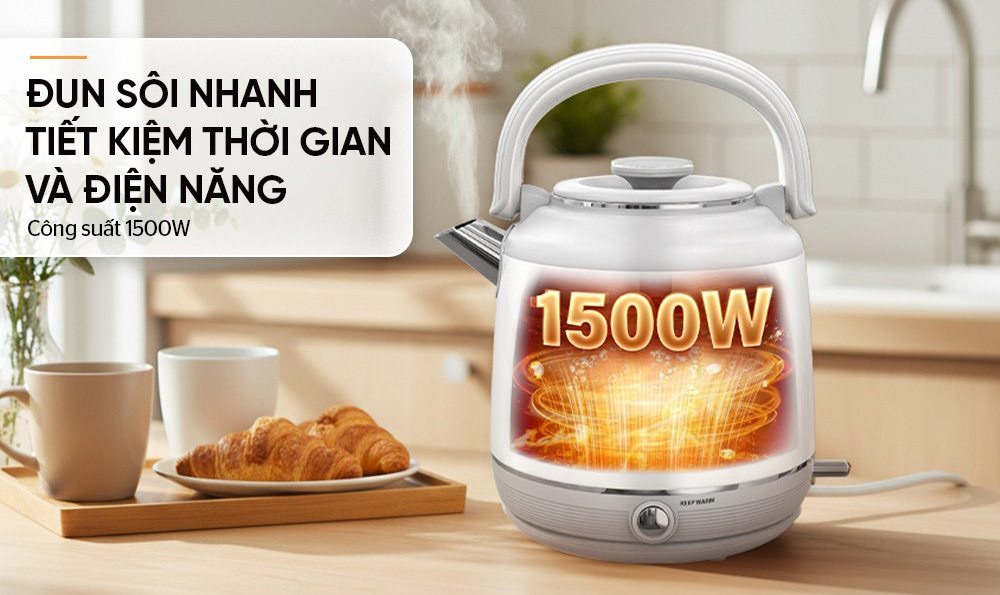 Công suất mạnh 1500W cho thời gian nấu nước nhanh chóng, giúp tiết kiệm điện năng tối đa cũng như hạn chế thời gian chờ đợi.