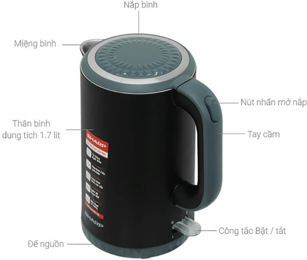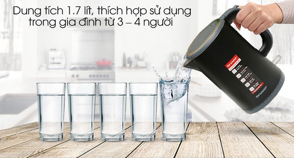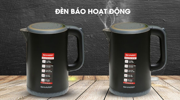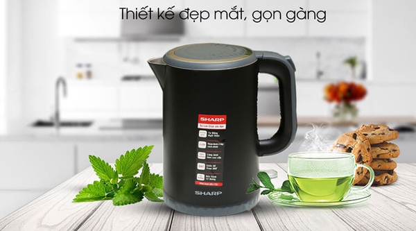 Bình đun siêu tốc Sharp thiết kế gọn gàng, màu đen lôi cuốn, đẹp mắt, tô điểm cho không gian bếp gia đinh, quán ăn, khách sạn... thêm hiện đại, tươi sáng.