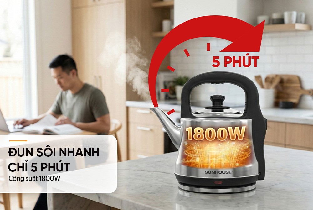 Công suất 1800W cho thời gian nấu nước nhanh chóng, chỉ chưa đầy 5 phút là nước đã được nấu sôi để pha trà, cà phê, nấu mì…hoặc để nguội và uống. Việc đun sôi nhanh cũng giúp tiết kiệm thời gian và điện năng tối đa.