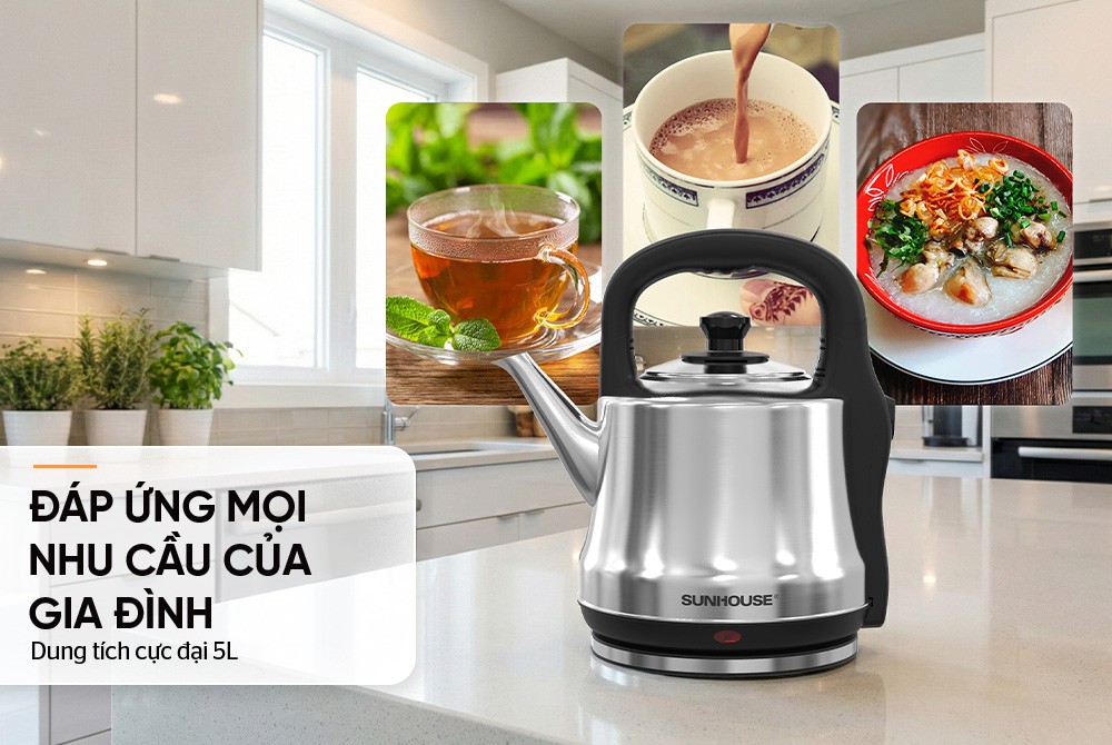 Bình đun siêu tốc inox Sunhouse SHD1403 có dung tích lớn 5 lít cùng công suất 1800W đun nước nhanh sôi, đáp ứng tốt nhu cầu sử dụng của gia đình, văn phòng, hoặc nếu bạn mở quán thì bình đun này cũng là 1 sự lựa chọn đúng đắn.