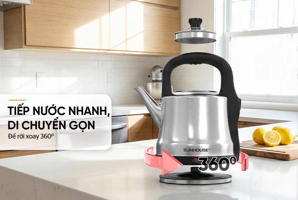 Đế tiếp điện được thiết kế độc lập, tách rời khỏi thân bình, giúp việc đổ nước - tiếp nước dễ dàng, linh hoạt. Bình có thể xoay 360 độ trên đế tiếp điện, người dùng có thể đặt bình lên hay nhấc ra khỏi đế ở bất cứ góc nào mà không phải lo lắng đến vấn đề phải đặt sao cho khớp.
