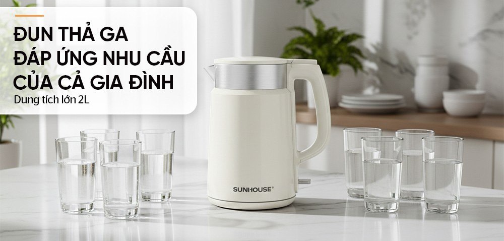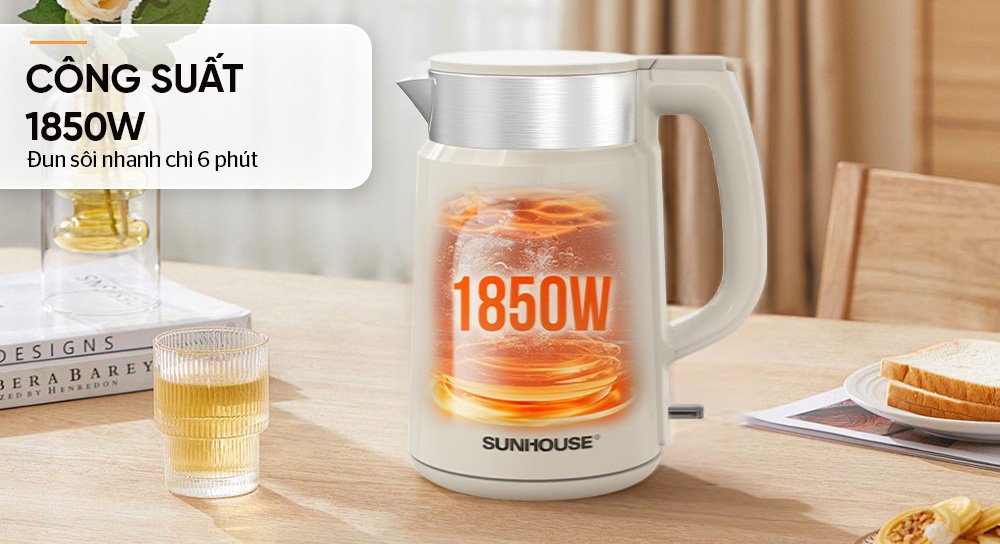 Bình đun siêu tốc inox Sunhouse SHD1387 có dung tích lớn 2.0 lít cùng công suất 1850W đun nước nhanh sôi, đáp ứng tốt nhu cầu sử dụng của gia đình, văn phòng, quán nước,...