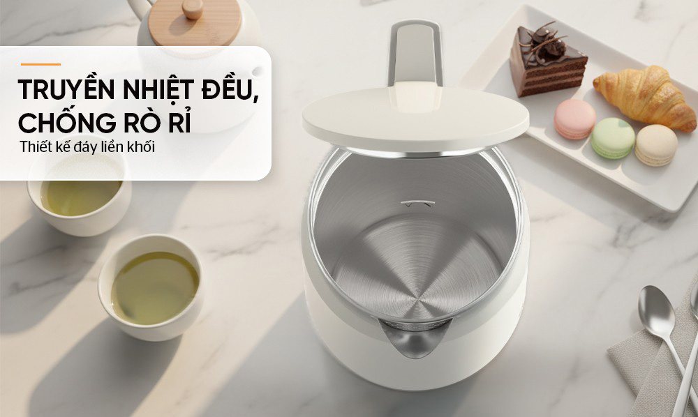 Lòng bình có phần đáy dạng liền khối dập sâu chắc chắn, đảm bảo khả năng truyền nhiệt nhanh và đồng đều. Với thiết kế này cũng giúp chống rò rỉ nước, tăng độ bền và an toàn cho thiết bị, đặc biệt trong quá trình sử dụng lâu dài.