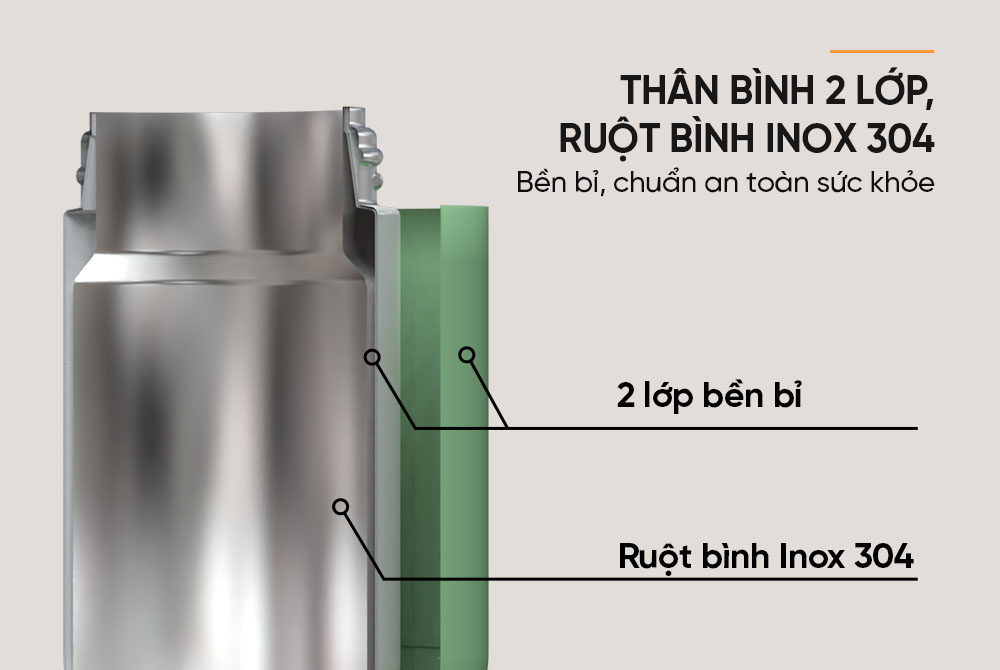 Cấu tạo thân bình 2 lớp giúp cách nhiệt hiệu quả, giữ nhiệt tốt hơn. Bề mặt phủ lớp sơn tĩnh điện bền bỉ, chống bong tróc và hạn chế trầy xước, giữ cho bình luôn đẹp mới trong suốt thời gian sử dụng.